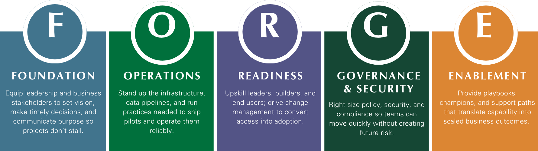 FORGE Enablement - Outputs: Production ready pilot(s) with measurable ROI, role-based enablement (champions, office hours, playbooks), policy pack & controls, runbooks, and a success metrics dashboard.